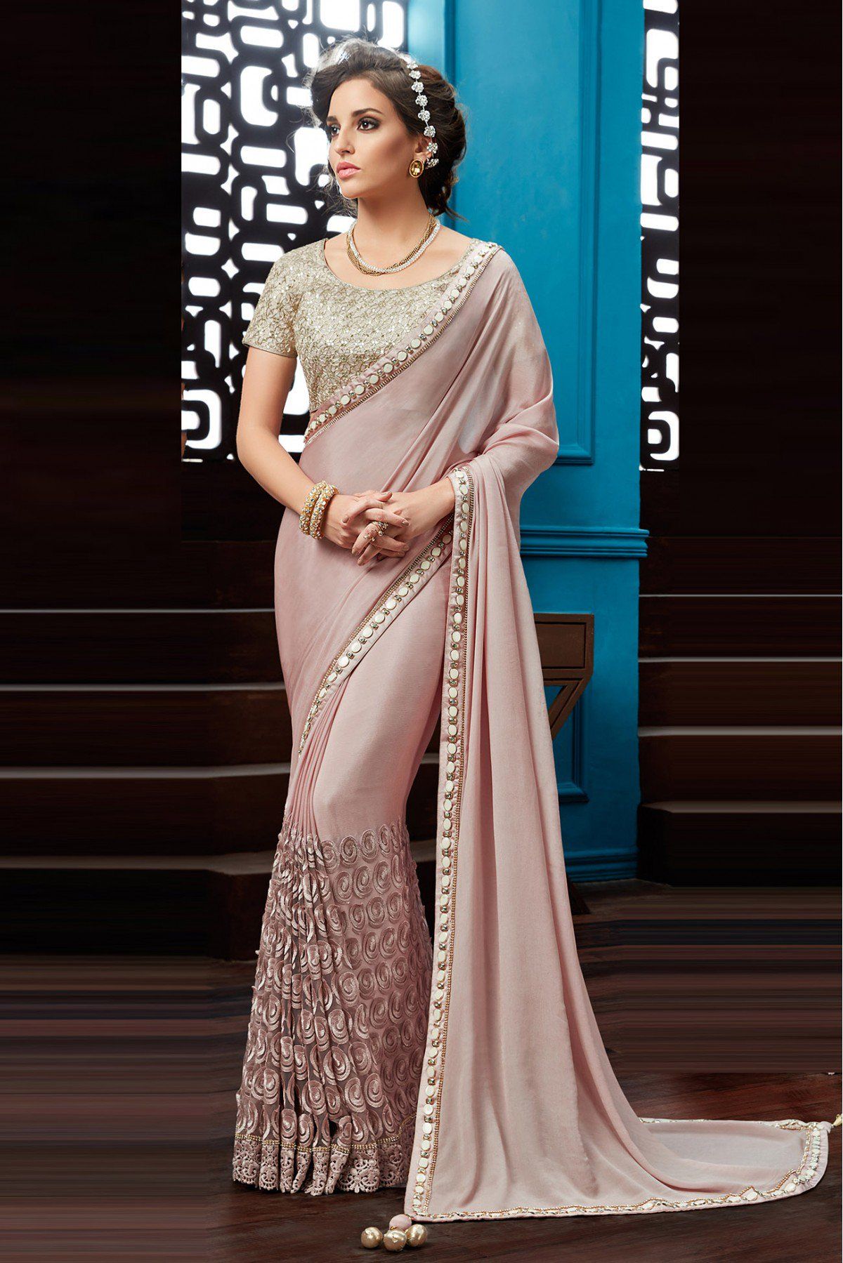 The chiffon fabric, lightweight yet plush, drapes beautifully, shows the wearer's figure with modesty and grace. It represents the classic feminine beauty celebrated in Indian culture, making it a favored choice for generations of women.