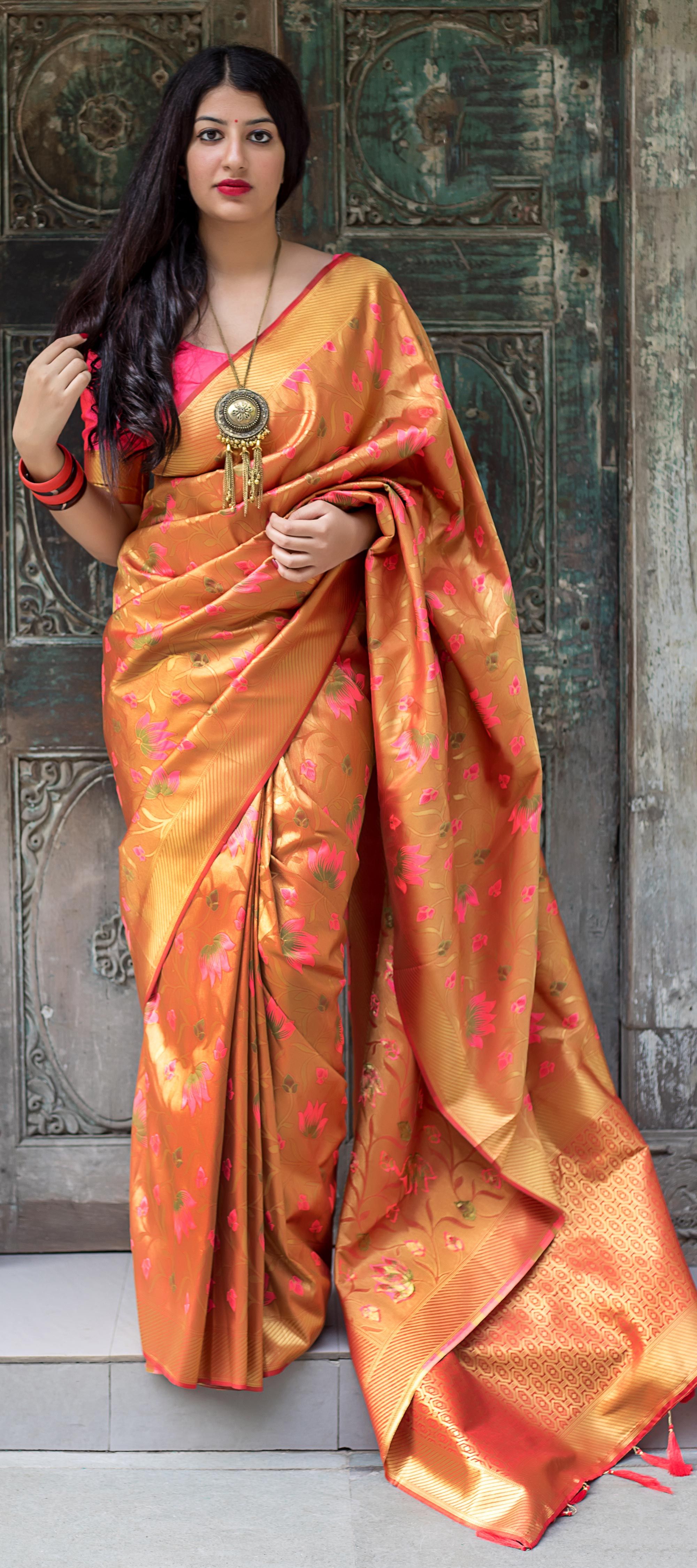 Each khanachi saree is a showcase to skilled skilled workers who painstakingly weave and embroider old patterns using age-old techniques. The result is a garment that displays feminine grace, modesty, and classic appeal, perfect for passing down through generations.