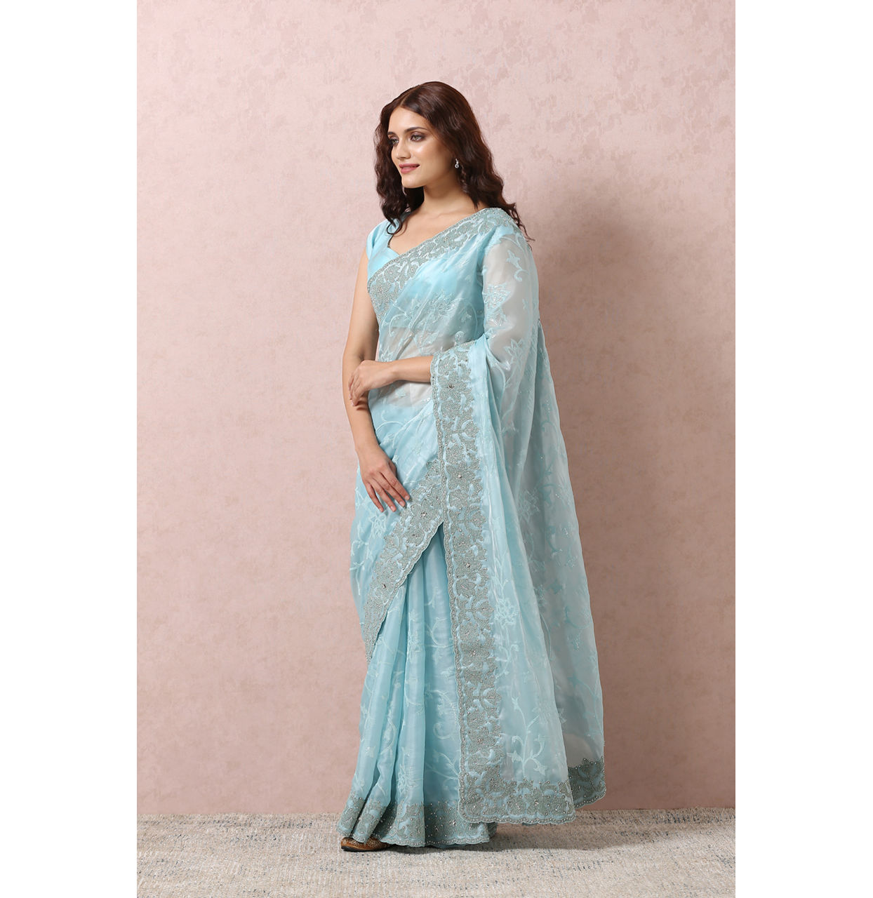 The light blue saree is a cherished family heirloom, passed down from mothers to daughters. It's the perfect blend of old-world charm and new-age appeal, making it an ideal choice for women of all ages. Whether you're attending a family wedding or simply enjoying a historic evening at home, this saree is always in fashion.