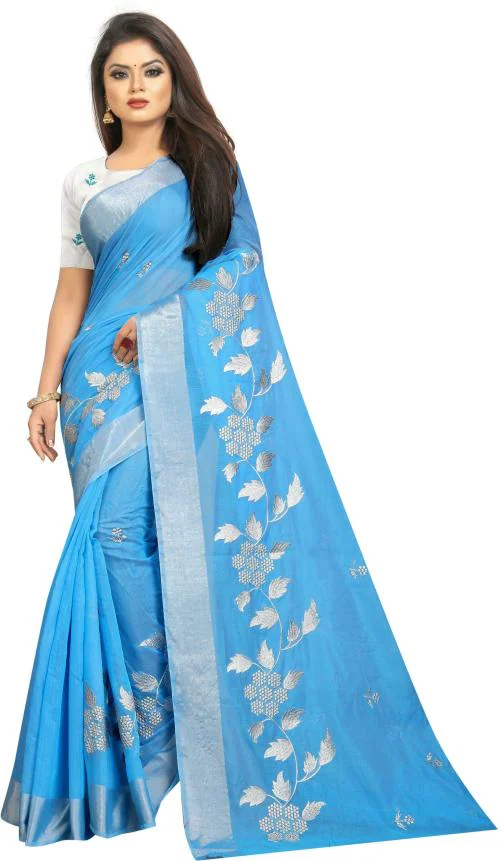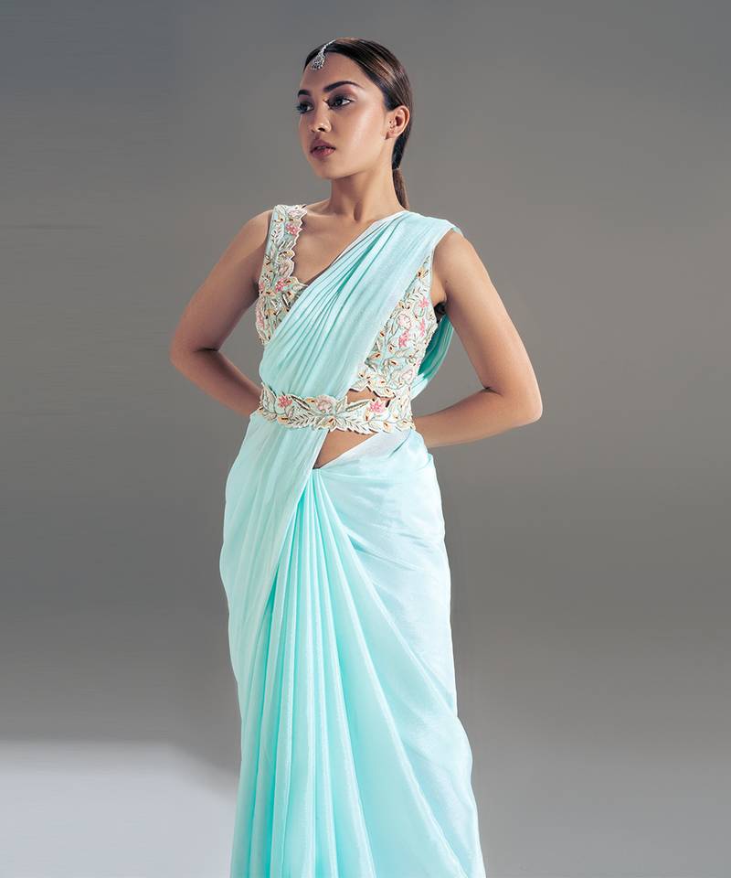 Our light blue saree is crafted with fancy handwork that echoes ancient artisan traditions. The rich, forever design expresses modesty and grace, making it a fitting choice for those who wish to honor their cultural past during family gatherings and rituals.