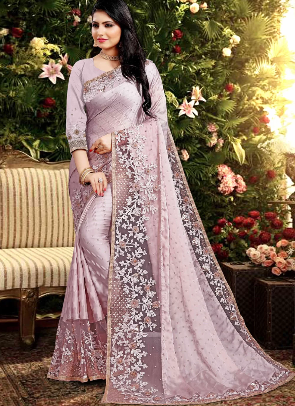 Our new design stone work saree is a beautiful fusion of ancestral values and modern elegance, perfect for family gatherings and cultural celebrations. Each saree features fragile stonework, carefully handmade by skilled creators, preserving the rich roots of Indian textile arts. This stylish wear reflects feminine modesty and grace, with its soft, flowing fabric and tasteful adornments. Ideal for old occasions, it adds a touch of elegance and cultural importance to any look. Rooted in generational traditions, our stone work saree is more than just an item of clothing – it's a symbol of the classic beauty and dignified elegance that Indian women have cherished for centuries. Pair it with complementary jewellery and accessories for a gorgeous old look. Experience the handwork and art of our new design stone work saree, and embrace the rich cultural tradition that makes Indian traditions so special and captivating.