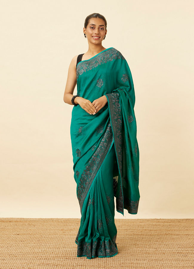 The new design stone work saree is a rich weave of old motifs that tell stories of India's past. Each 'stone' - intricately designed with tiny mirrors and beads - represents a different tale, from the lotus (symbolizing purity) to the peacock (personifying joy).
