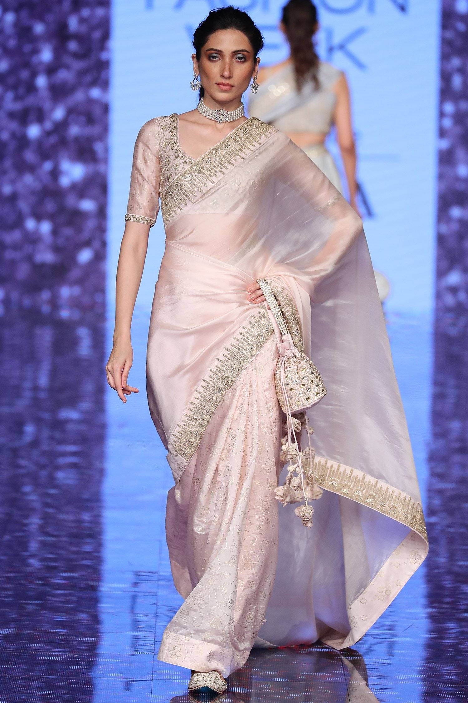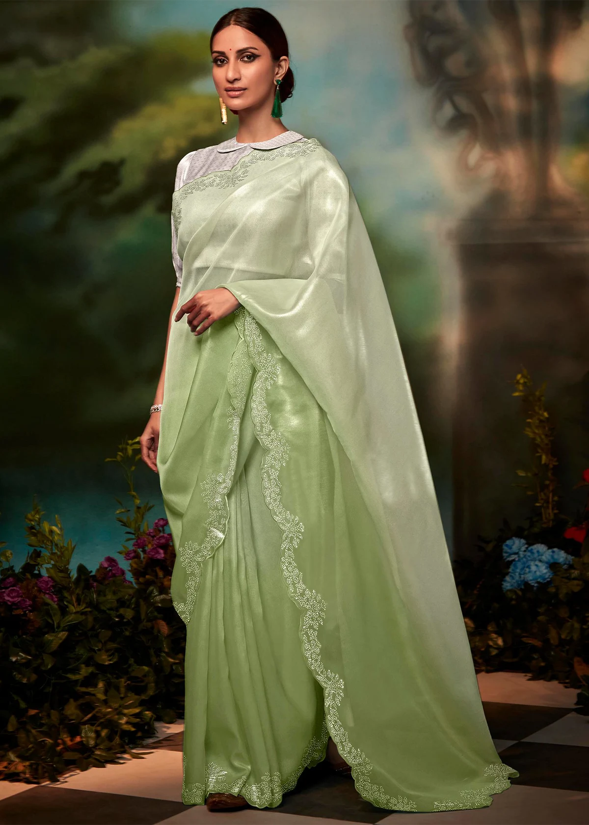 The designs adorning Gulbhahar's organza sarees are rooted in Indian art and architecture, featuring classic motifs like paisley, floral patterns, and geometric shapes. These symbols carry deep cultural meaning, representing good fortune, prosperity, and harmony, making each saree a wearable piece of history.
