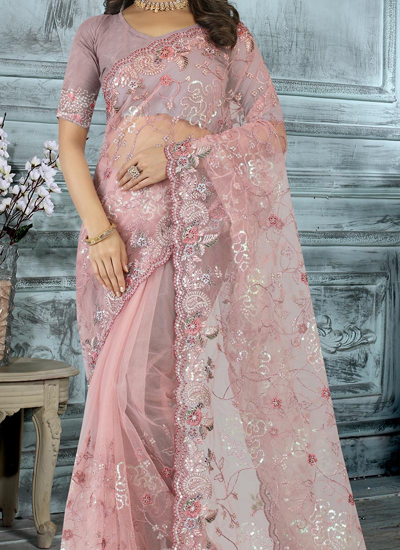 Our pink wedding saree features fancy zari work and hand-embroidered motifs that reflect artisan art. These designs, rooted in cultural past, add a touch of royalty to the outfit, honoring customary values while ensuring the wearer feels graceful and graceful.