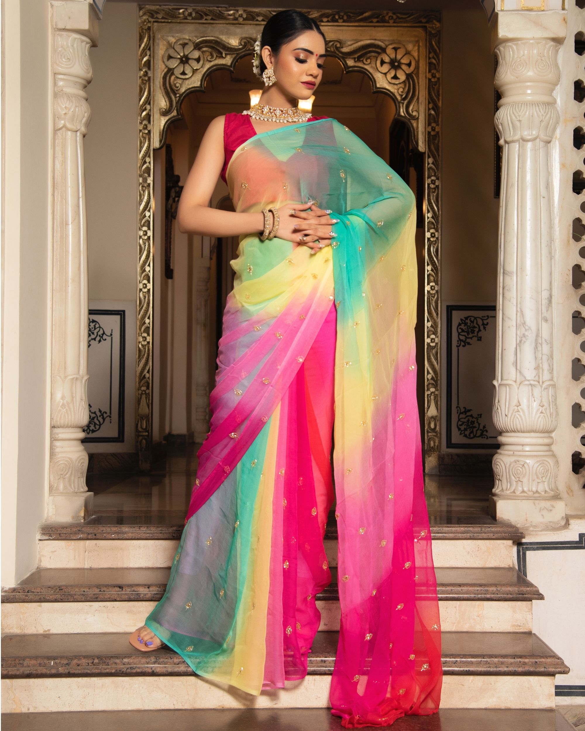 Our pure chiffon saree is a blend of many regional influences, from the 'Phulkari' embroidery of Punjab to the graceful 'Bandhani' tie-dye technique of Rajasthan. Each saree tells a story of India's wide-ranging cultural tradition, making it a true representation of our nation's rich design.