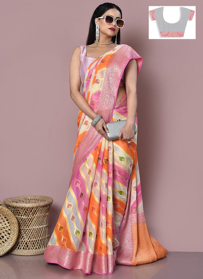 Gulbhahar's pure chiffon saree reflects grace, modesty, and the ageless beauty of Indian traditions. Expertly handmade by skilled makers, this fancy saree is perfect for family gatherings and cultural celebrations.