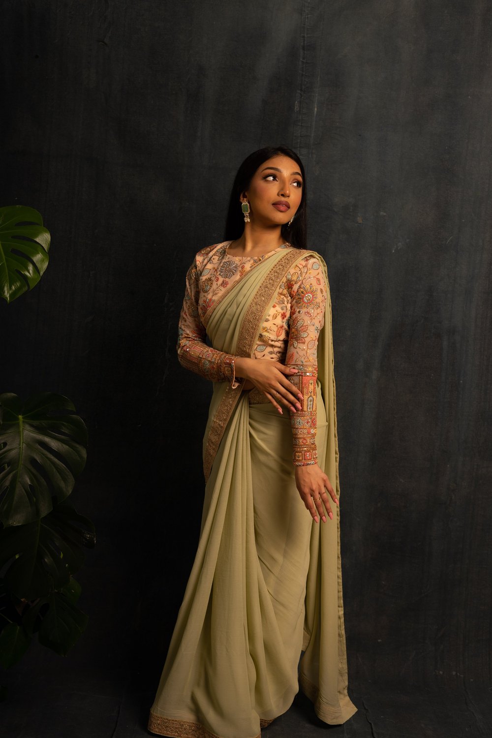 The reception saree look is carefully crafted to honor age-old traditions, with fancy handwork and design elements that reflect our rich cultural past. It emphasizes modesty and grace, making it perfect for those who cherish enduring elegance.