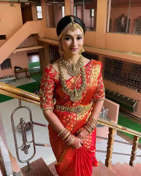 To preserve cultural roots during a family puja, drape your red bridal saree in the past Nivi style. This not only presents modesty and grace but also allows you to sit comfortably for prayers and rituals.