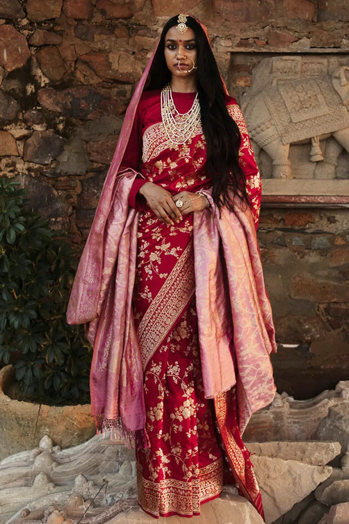 Gulbhahar's red bridal saree is a reflection to the enduring beauty of roots Indian textiles, passed down through generations. Our master weavers skillfully craft each saree with fancy patterns and fragile embroidery, honoring the tradition of their ancestors who have been weaving tales into fabrics for centuries.