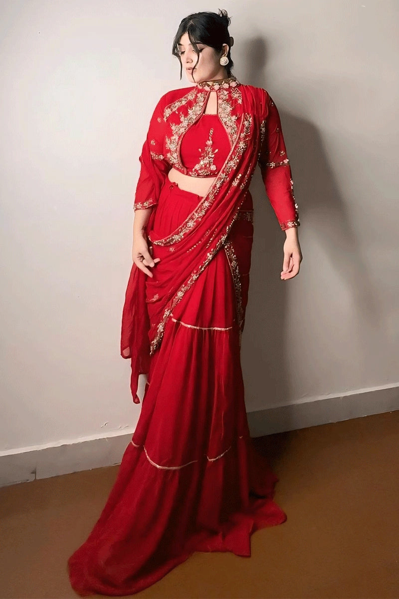 Gulbhahar's red saree features the perfect of feminine grace and modesty. The traditional draping technique, known as 'lehenga style', emphasizes your curves while maintaining a modest form – perfect for family gatherings and religious ceremonies. This classic style ensures you look classy yet comfortable in every setting.