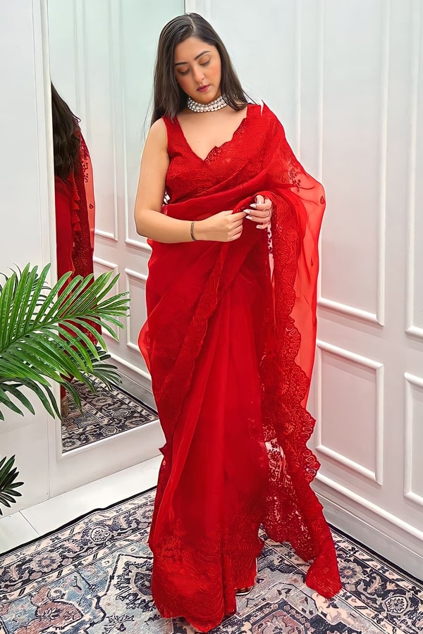 The red saree is an indispensable part of Indian festivals and ceremonies, with Karwa Chauth being one of its most big occasions. This lively hue symbolizes prosperity, good fortune, and the triumph of good over evil – themes deeply ingrained in our cultural narratives. Wearing this saree on Karwa Chauth honors these traditions and adds a touch of festive fervor to your celebrations.