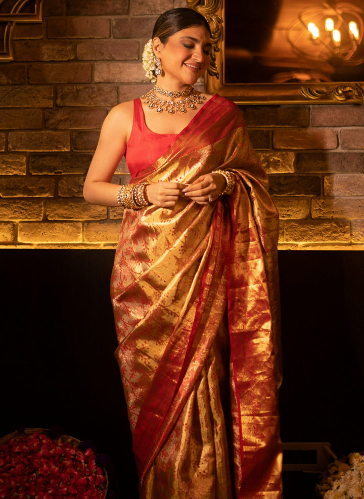 A Gulbhahar red saree is not just an traditional wear for today, but an heirloom for tomorrow. Crafted with ageless elegance and superior quality, it tops generations. It's the perfect garment to pass down as a family tradition – from mothers to daughters, from grandmothers to grandchildren, carrying with it tales of love, laughter, and shared tradition.