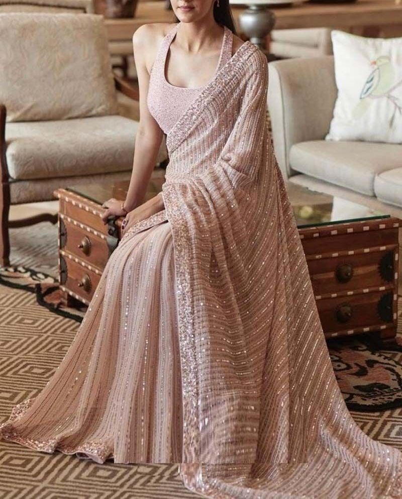 The sequin saree represents the essence of old elegance. The way it falls, catching light at every fold, is a dance of modesty and beauty. It's not about revealing too much; it's about celebrating what lies beneath with grace and dignity.