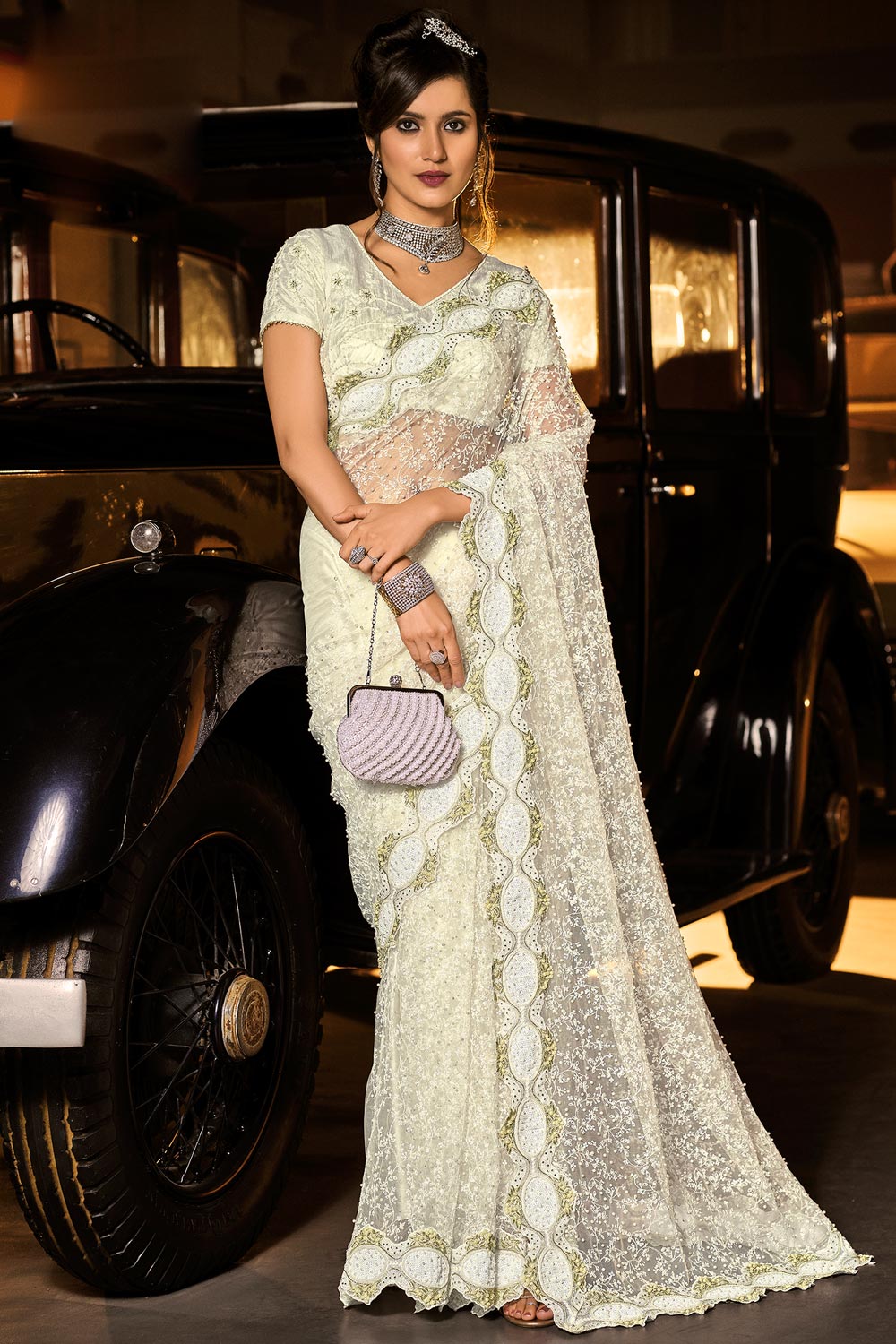 Each white net saree at Gulbhahar features fragile handwork like zari embroidery or mukaish. These artisan techniques preserve centuries-old craft traditions, symbolizing the rich textile of India's cultural roots and feminine grace.