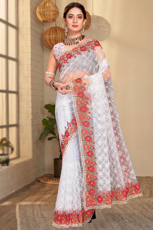 The white net saree reflects enduring feminine grace. Its sheer fabric allows for a flow that enhances the wearer's natural style, while its modesty makes it suitable for both historic and modern occasions. It is a saree that celebrates womanhood in all its forms - graceful, graceful, and confident.