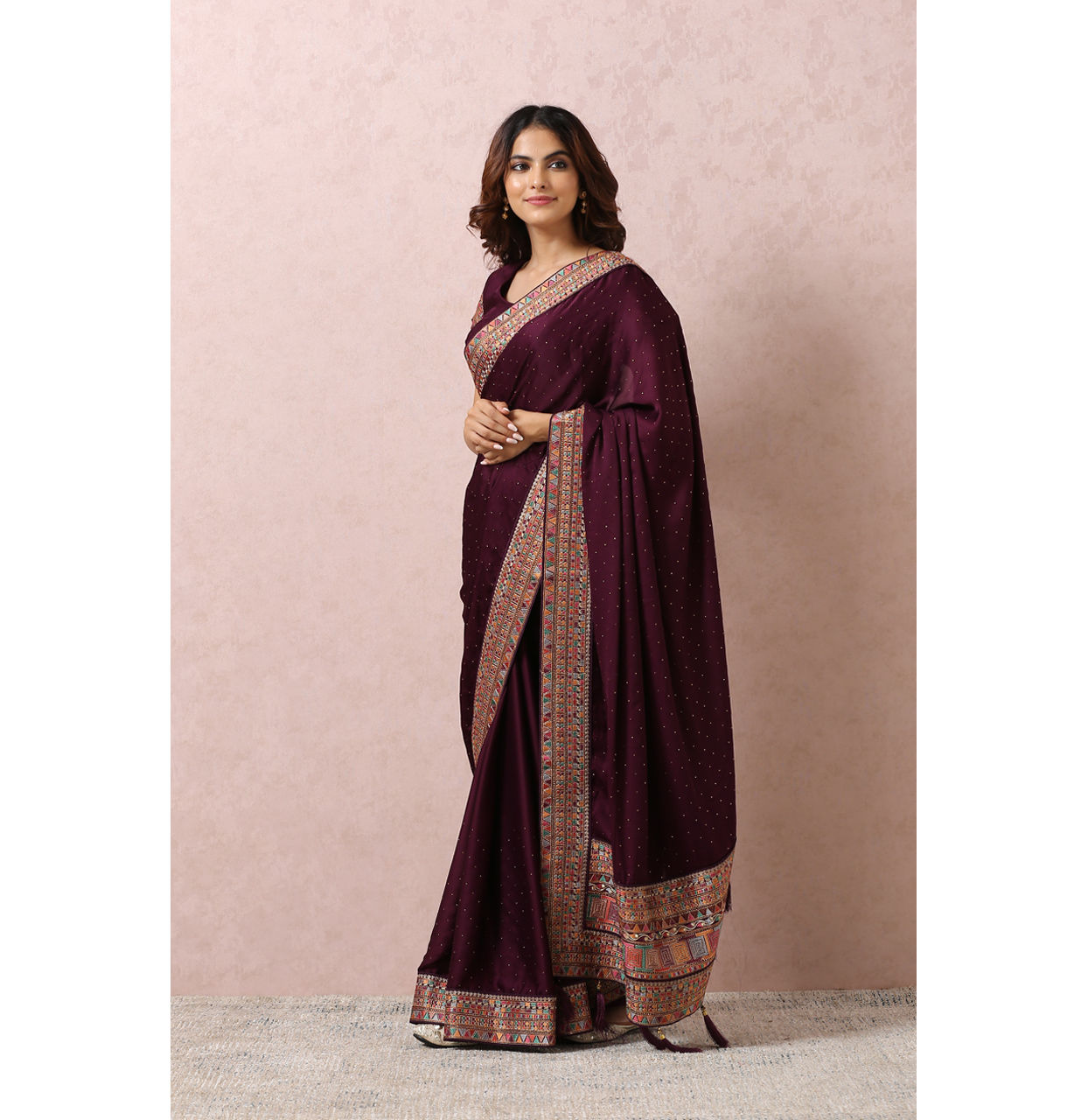 Our 'wine color saree' pays dedication to the varied cultural traditions of India. The use of old Bengali jamdani weave or the rich zari work of Gujarat, each saree carries a piece of regional tradition while serving as a symbol of unity and grace for women worldwide.