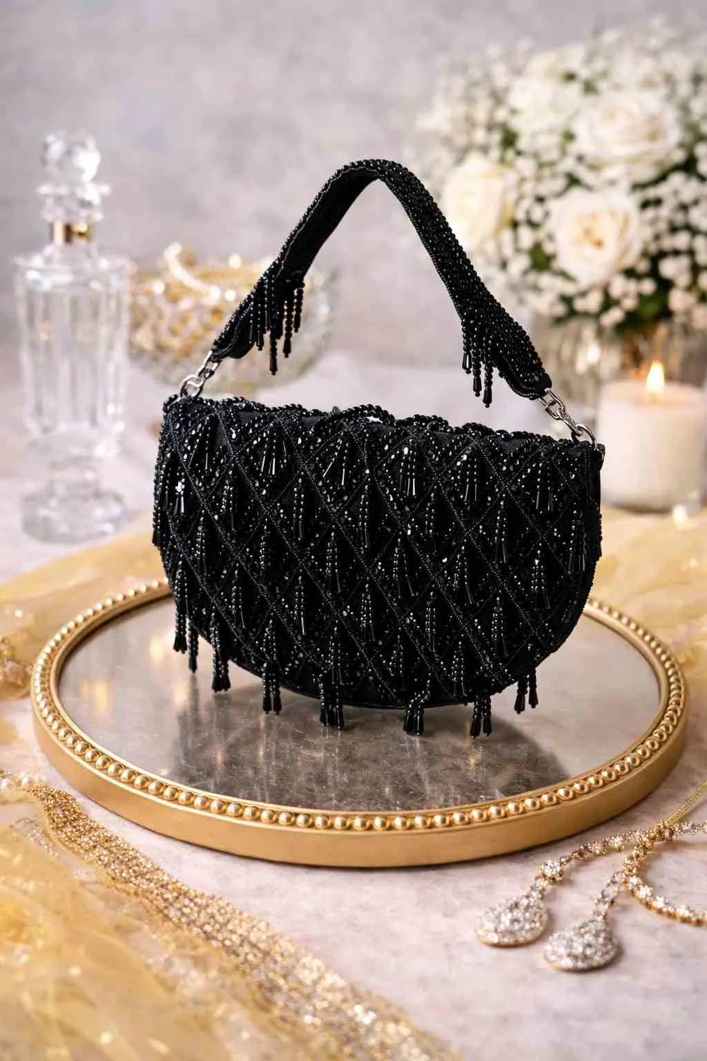 - Hand-beaded with glistening black crystals and intricate lattice patterns, she’s the kind of bag that doesn’t whisper luxury, she purrs it softly in emerald tones.