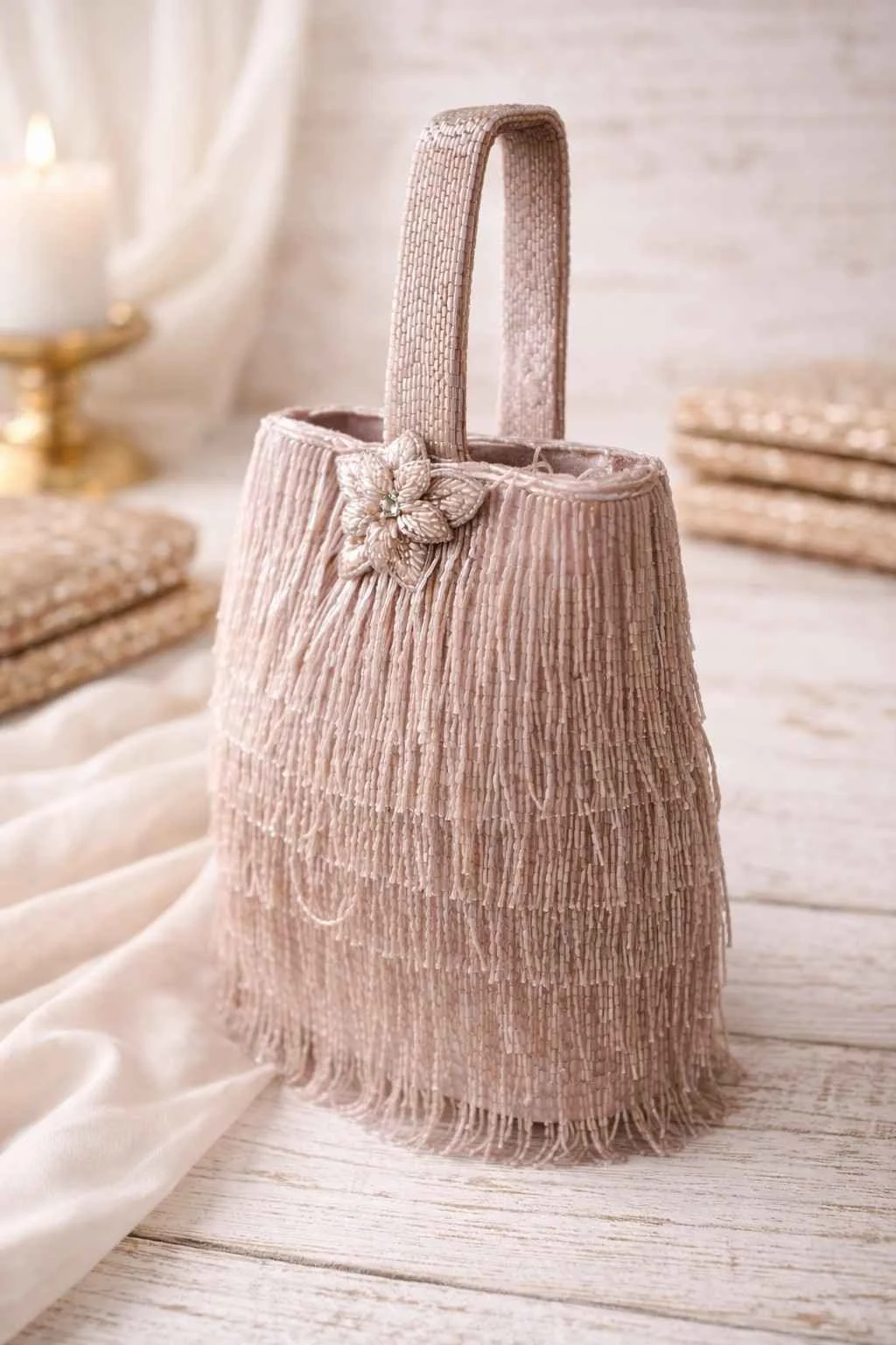 ✦Hand-beaded in delicate mauve tones and layered with playful fringes that dance with every step you take