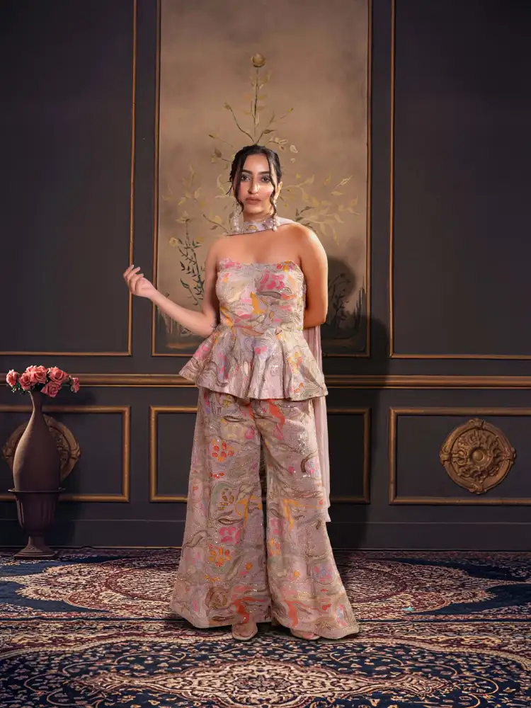 Peach Floral Embroidered Indo-Western Jumpsuit with Dupatta