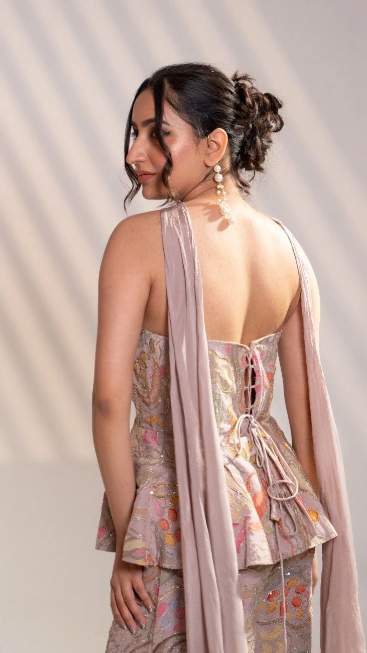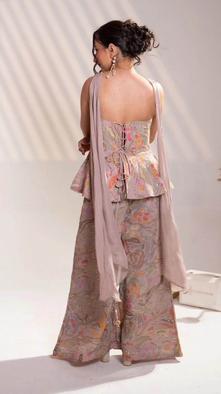 Lavender Embroidered Strapless Bustier, Straight Palazzo Pants with Dupatta (Set of 3)