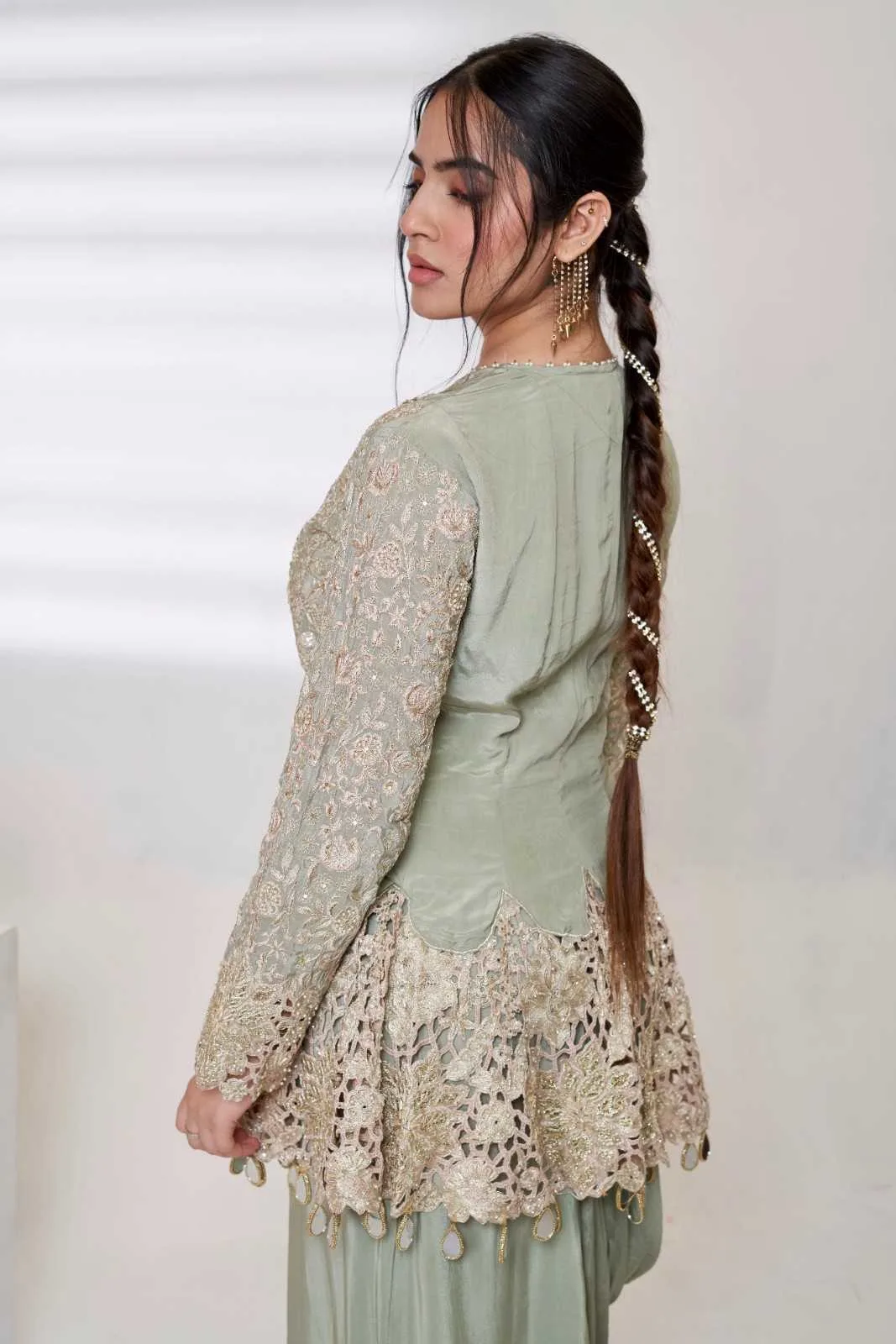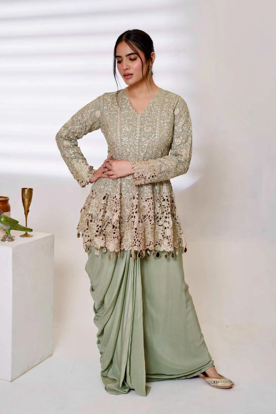 • Experience the festive charm with this beautiful pastel green set, crafted to radiate the gold accents. The net silk blend fabric is light, smooth, and elegant. The kurti has heavy embroidery work with intricate floral and geometric designs.