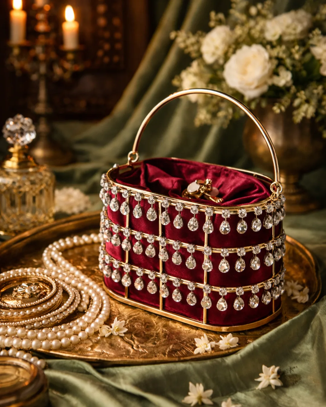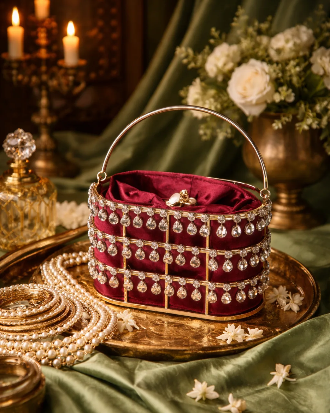 ✦The soft satin pouch within holds your treasures close, while the structured metallic handle adds a touch of modern grace.