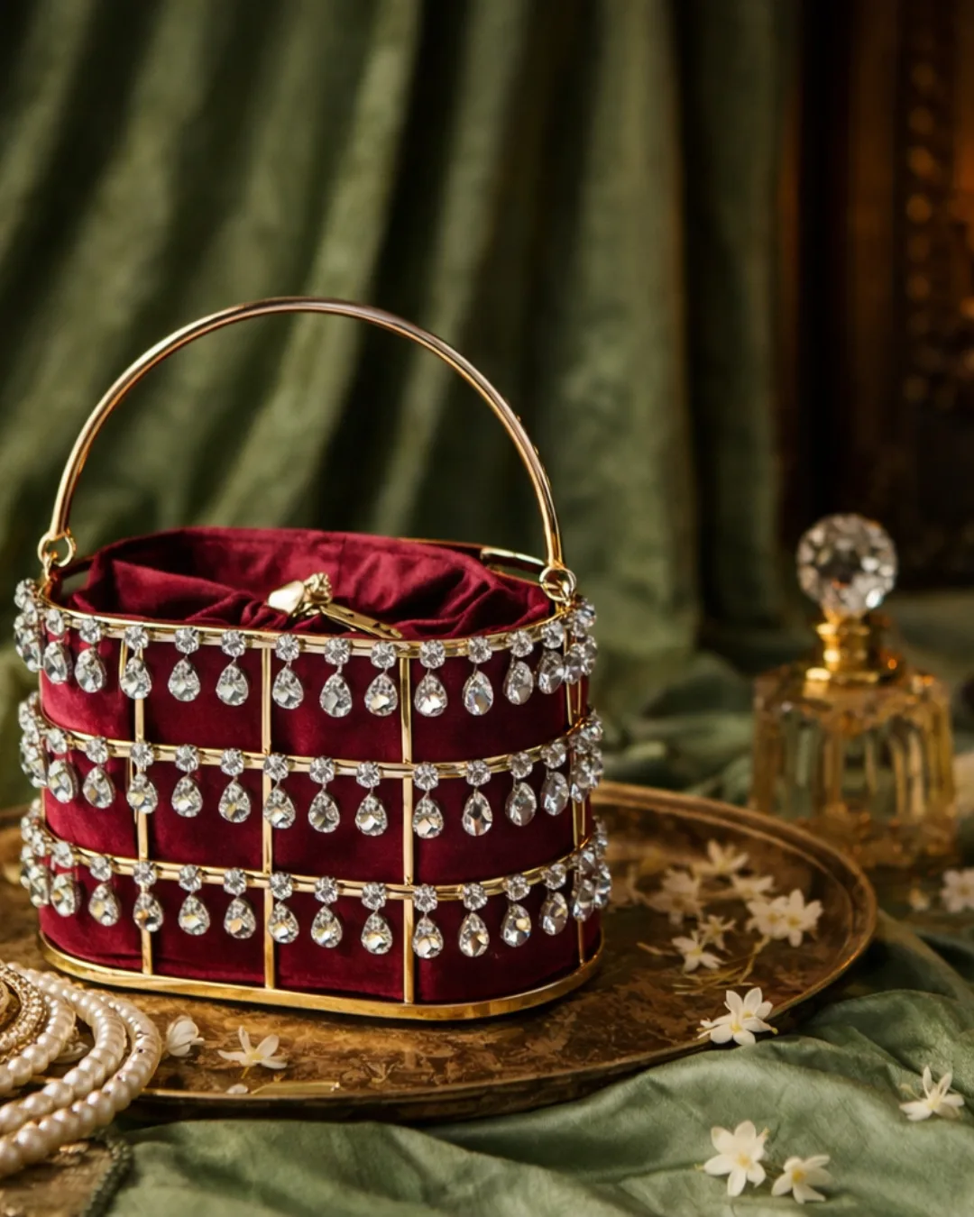 ✦Sufiana is a maroon velvet masterpiece embraced by golden latticework and cascading crystals.
